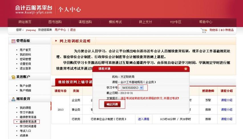 完善继续教育信息后,点击网上继续教育,在课程列表里选择一门课程开通,每一个学习卡账号只能激活一门课程。