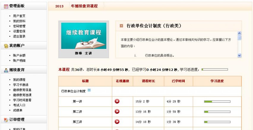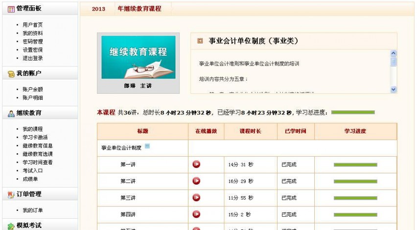 购买课程,进入讲座,即可看到该课程的详细内容,学习时间和学习进度