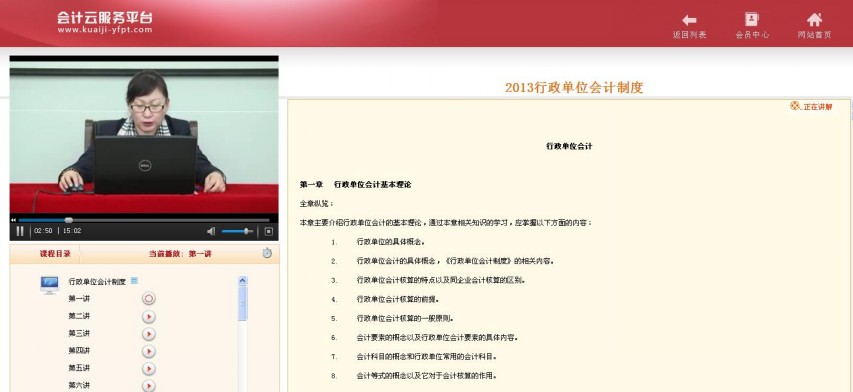 课程开通之后点击进入课程,会计云服务平台虽然支持不按顺序播放,但是为了保证听课质量和课程的连贯性,请学员按顺序学习课程。