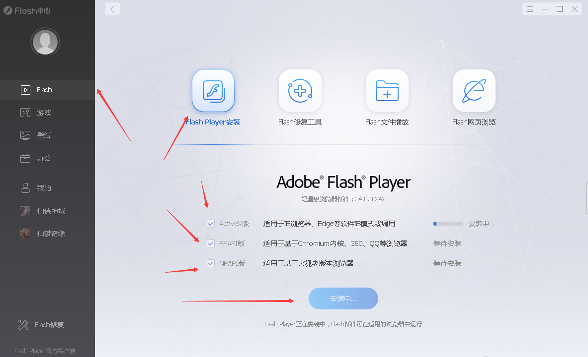 如果安装失败 点击右边flash中心一键安装 安装之后打开 选中左边的flash 第一项flash player安装