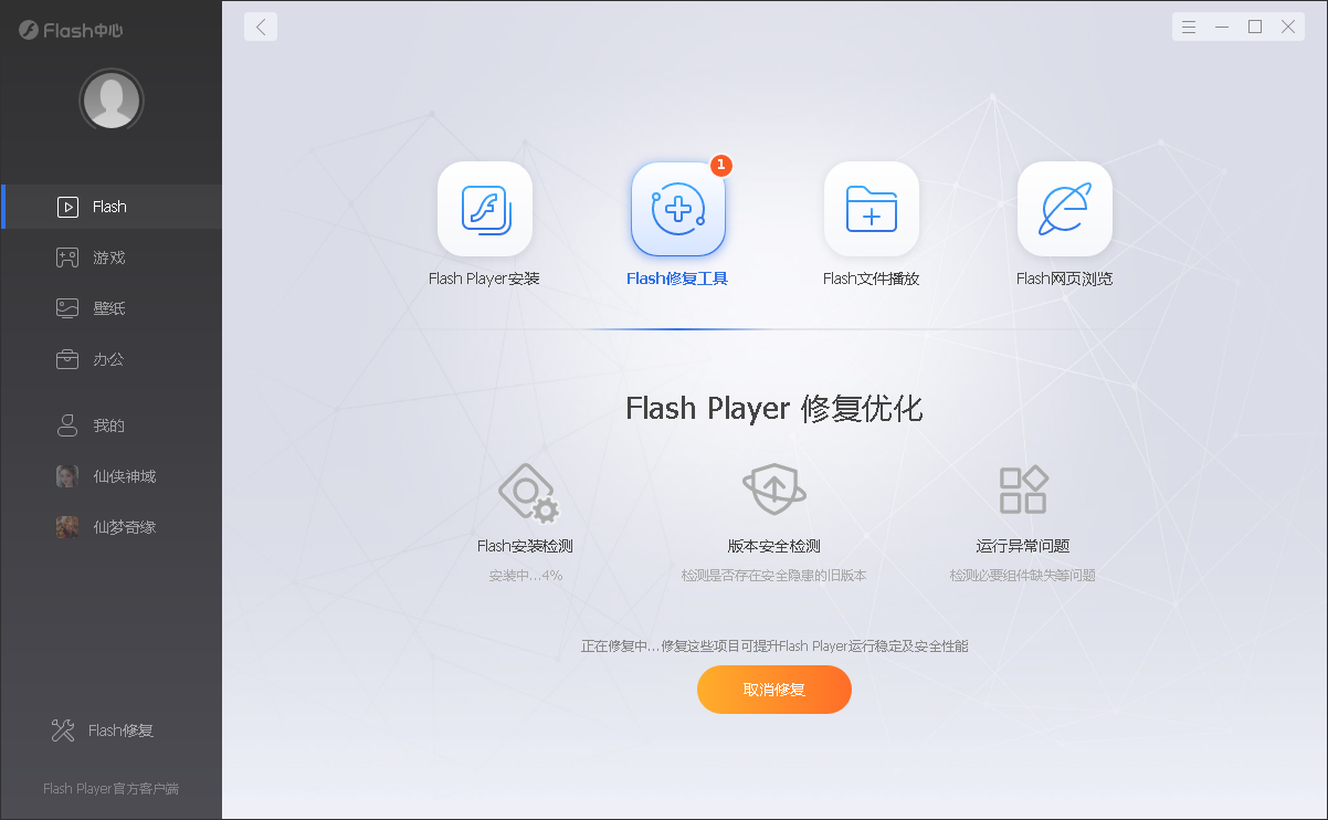 点立即修复下载flash中心 已有flash中心的点开flash中心 点左边的flash 再点击第二项flash修复工具 点击检测 出现问题后点击一键修复