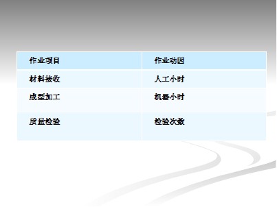 作业动因包括采购订单份数、验收单份数、检验报告数或时数、零部件储存数、支付次数、直接人工小时、机器小时、调整次数和制造周转次数等。