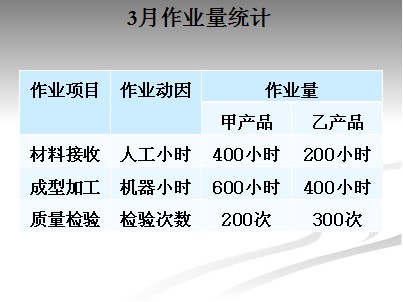 【例1】W公司是一家电器制造企业,生产甲、乙两种产品。B部门是W公司的一个生产车间,主要从事原材料接收、成型加工、质量检验三项工作。经分析分别选择人工小时、机器小时和检验次数作为三项作业的成本动因。