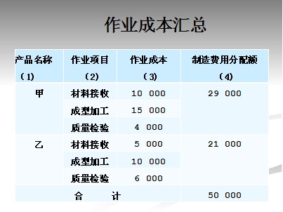 汇总三项作业的成本分配额,就可以计算出应分配到甲产品、乙产品的制造费 用分别为29 000元和21 000元,如表所示。